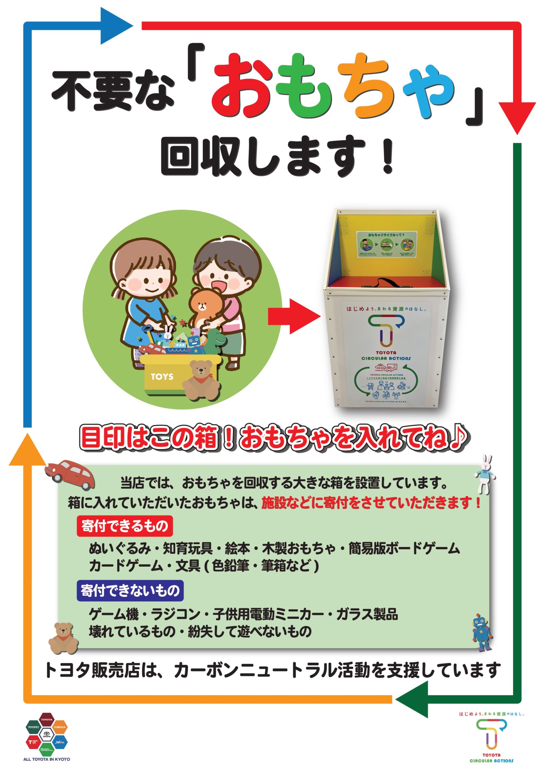 京都府オールトヨタ販売店では、カーボンニュートラルの実現に向けた循環型社会創出への取り組みの一環として、おもちゃ・知育玩具・絵本等の不用品を回収しリユースを実施する「おもちゃリサイクル活動」を行っています。